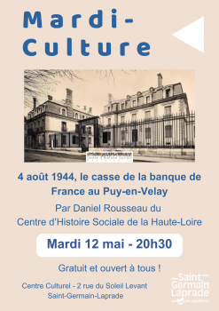 Vous êtes ici : Accueil > Mardi Culture : "4 août 1944, le casse de la banque de France au Puy-en-Velay"